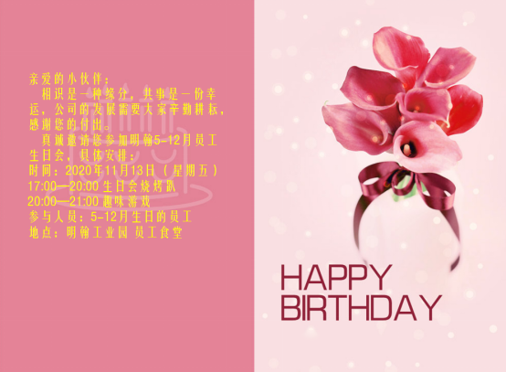 明翰电气一直坚持以人为本,人性化关怀,这里不仅是一个奋斗的地方,更是一个让员工们在这里感受到家庭般温暖的港湾。愿所有明翰人,年年有今日,岁岁有今朝!